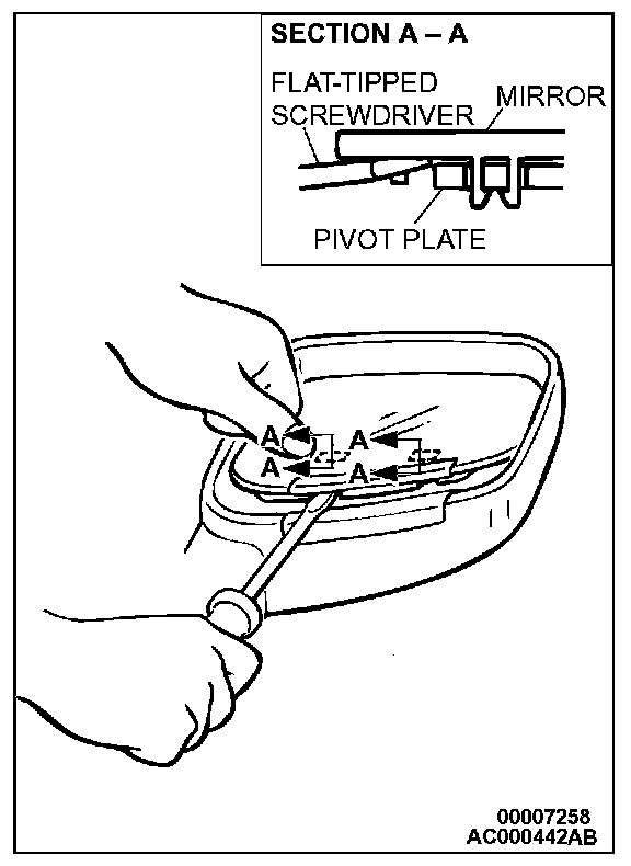 Push the top of the mirror with your hand to tilt it and attach the protective tape as shown in the illustration. Then insert a flat-tipped screwdriver in between the notch at the rear of the mirror and the pivot plate, and disengage the bottom of the mirror.