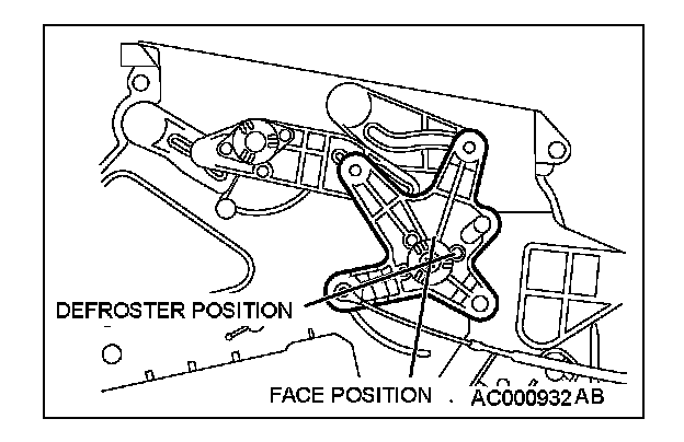 2. Set the air outlet changeover damper lever of the heater/ cooler unit to the defroster position as shown in the illustration, and then connect the cable to the link pin.