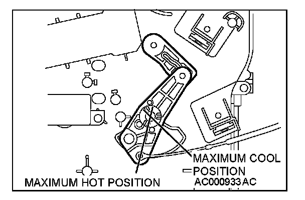 2. Set the air mix damper lever of the heater/cooler unit to the maximum hot position as shown in the illustration, and then connect the cable to the lever pin.