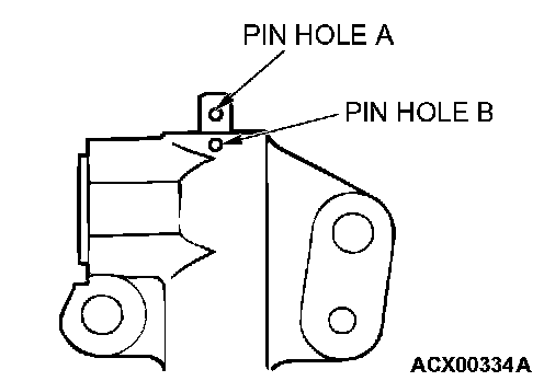 2. Align hole B with hole A, and insert a 5.0 mm (0.20 inch) Allen wrench to hold the tensioner. Then loosen the drive belt, and then remove the drive belt auto tensioner.