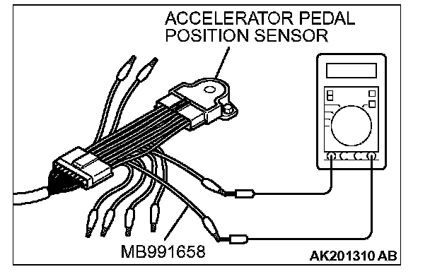 1. Disconnect the accelerator pedal position sensor connector, and connect the special tool (test harness: MB991658) to that connector. (Be careful not to confuse the terminal numbers.)