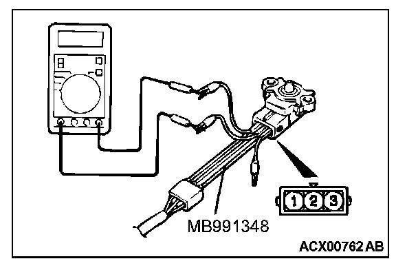 5. Disconnect the fuel tank differential pressure sensor connector and connect special tool MB991348 between the terminals of the disconnected connector.