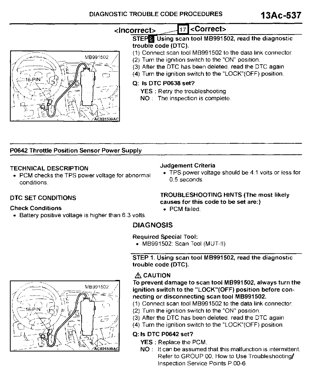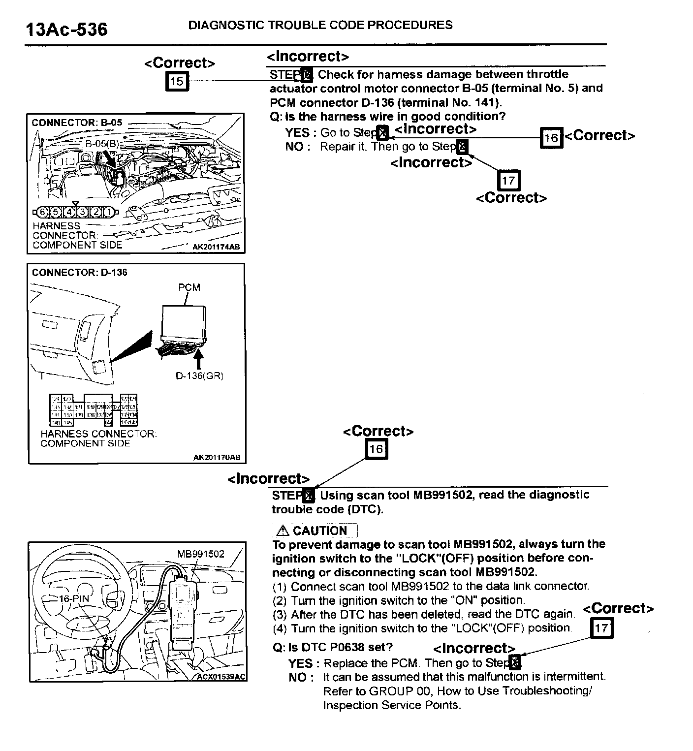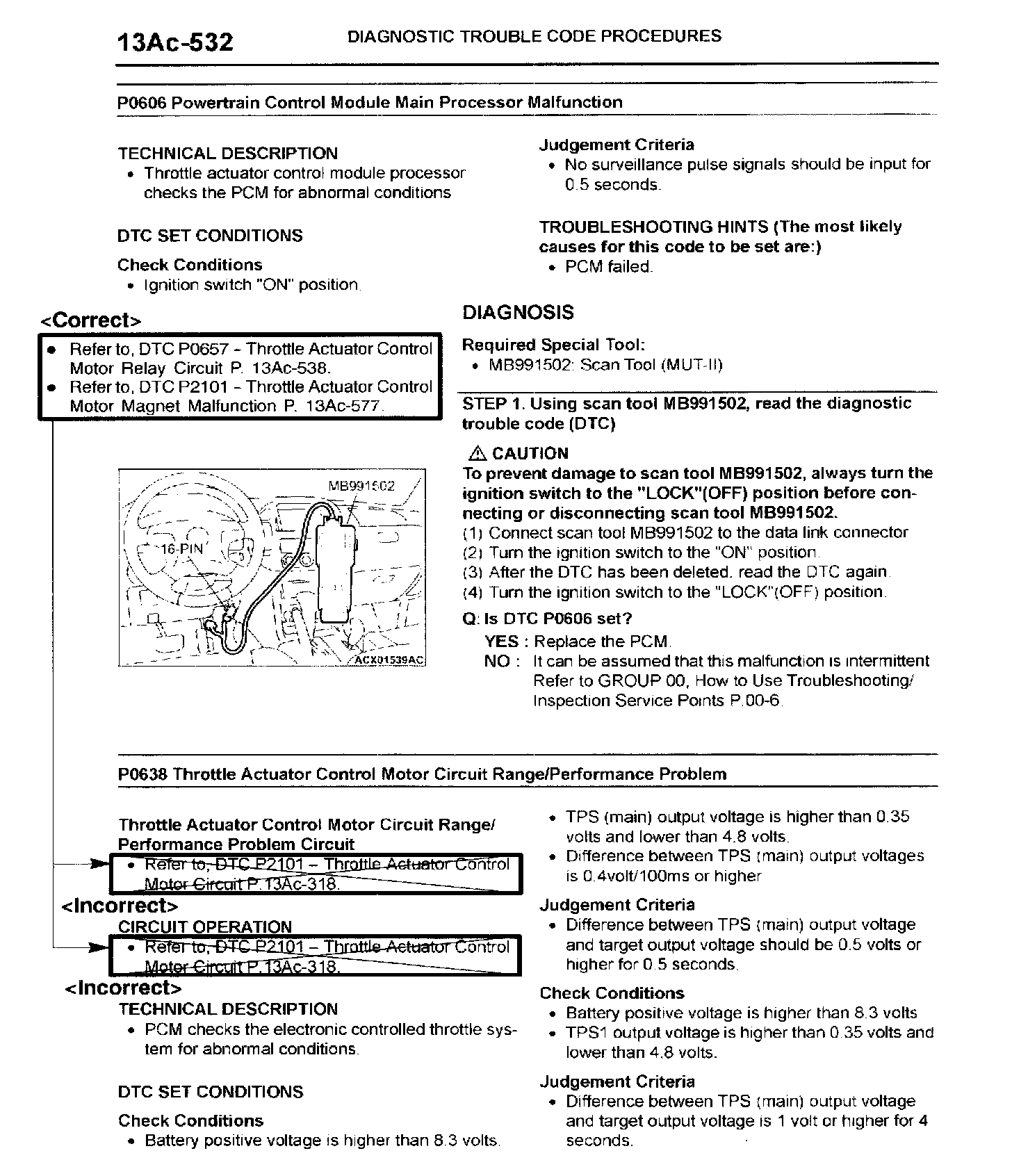 Diagnostic troubleshooting instructions in the 2003 Montero service manual for MFI Diagnostic Trouble Code P0638 "Throttle Actuator Control Motor Circuit Range/Performance Problem" are incorrect. This bulletin contains corrected troubleshooting instructions for DTC P0638.