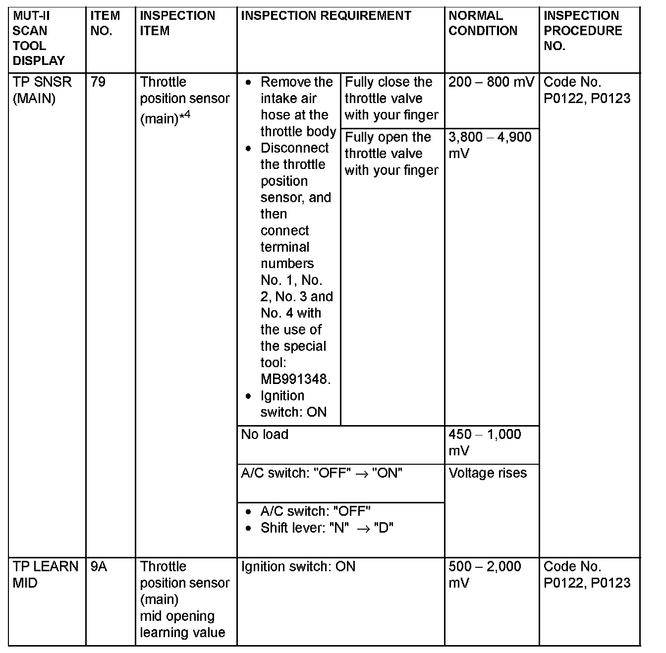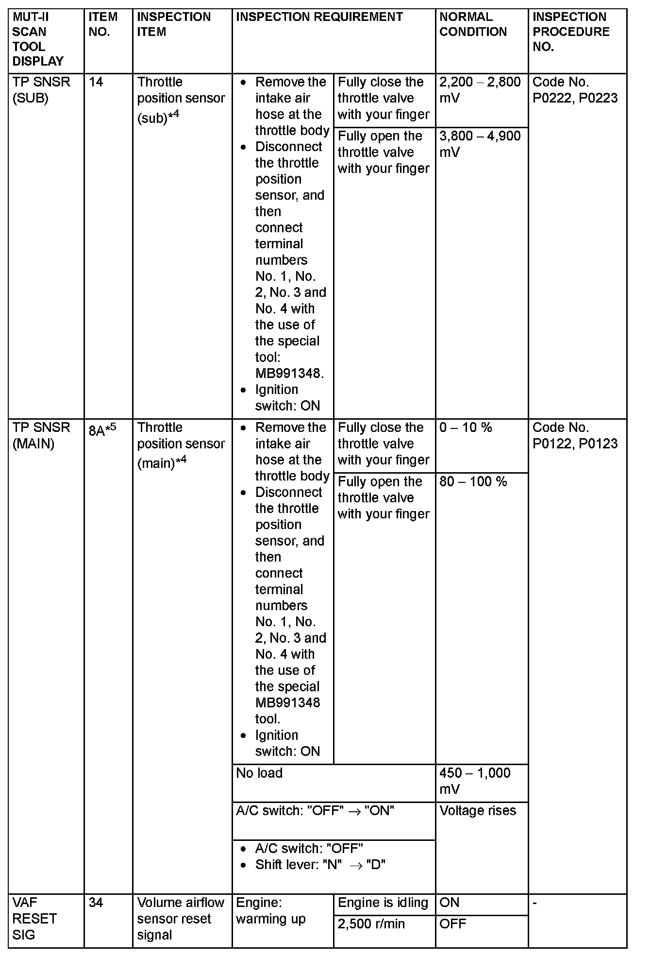 NOTE: *4: Disconnect the throttle actuator control motor connector, and then delete the diagnosis code that was recorded during the inspection with the use of the MB991502 scan tool after the inspection has been completed.