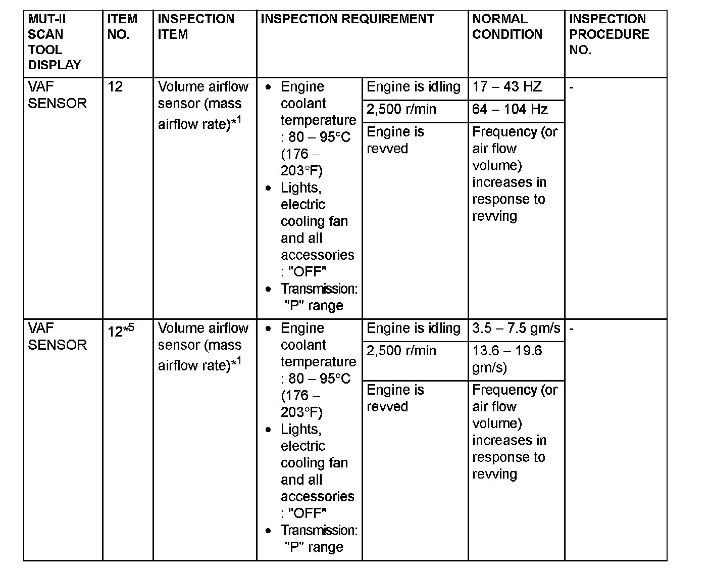 NOTE: *1: In a new vehicle [driven approximately 500 km (311 mile) or less], the volume airflow sensor output frequency is sometimes 10% higher than the standard frequency.