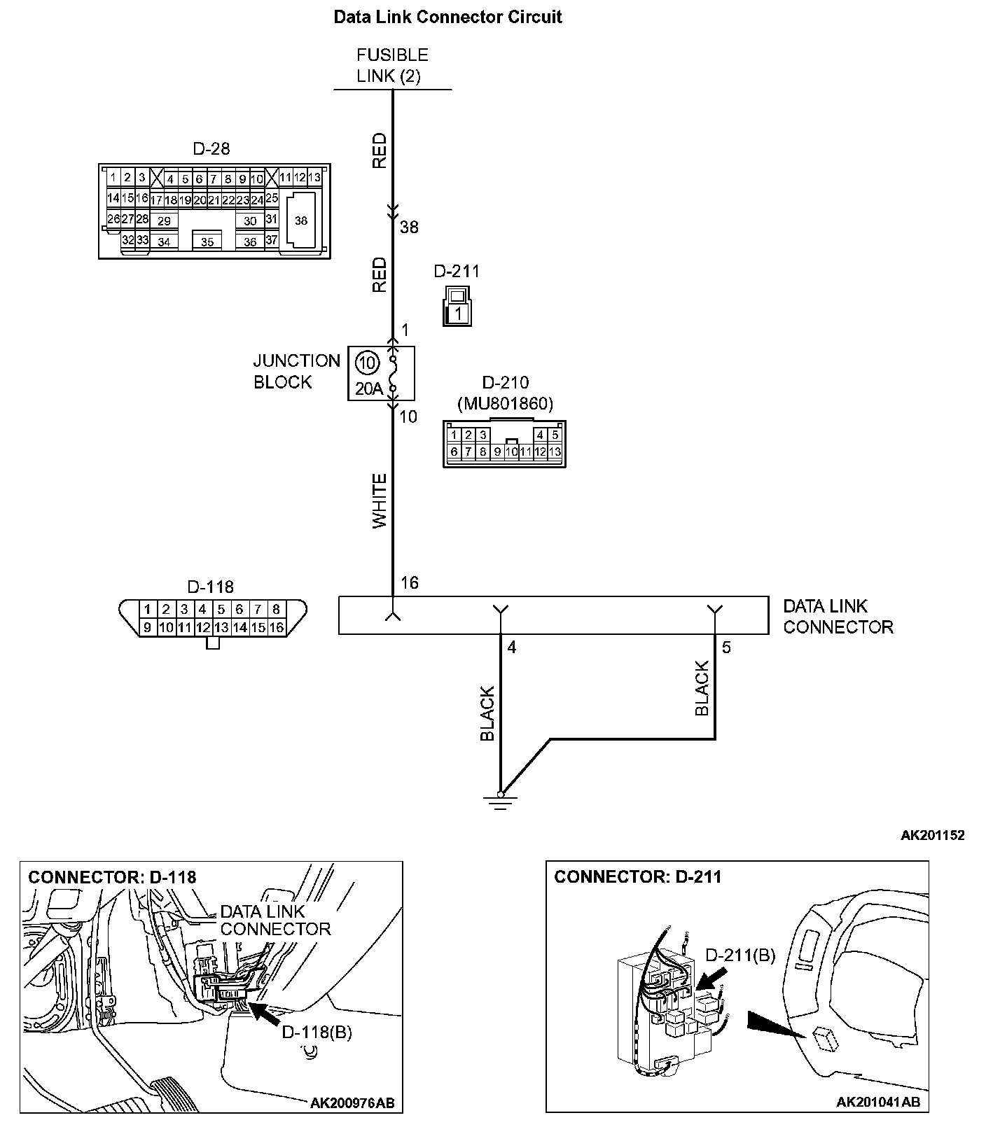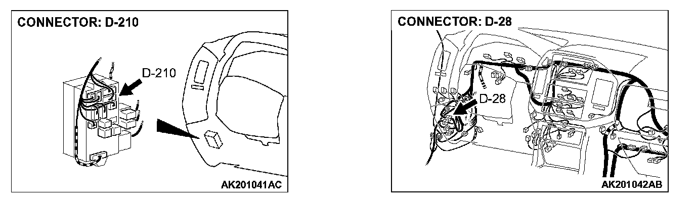 NO: Check harness connectors D-210, D-211, D-28 at intermediate connector for damage, and repair or replace as required. Refer to Harness Connector Inspection. If intermediate connector D-210, D-211, D-28 are in good condition, repair an open circuit between fusible link (2) and data link connector D-118 (terminal No. 16). Then confirm that the malfunction symptom is eliminated.