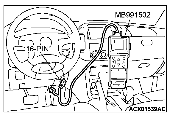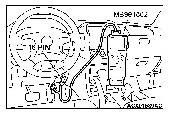 CAUTION: To prevent damage to scan tool MB991502, always turn the ignition switch to the "LOCK" (OFF) position before connecting or disconnecting scan tool MB991502.