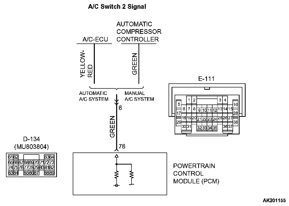 - The automatic compressor-ECU detects how the air conditioning is applying load to the engine, and converts the information to a voltage signal (High voltage = low load, Low voltage = high load). This voltage signal is called "A/C switch 2 signal". The PCM receives this A/C switch 2 signal from the automatic compressor-ECU through terminal No. 78, and determines the idle-up speed according to the high or low air conditioning load.