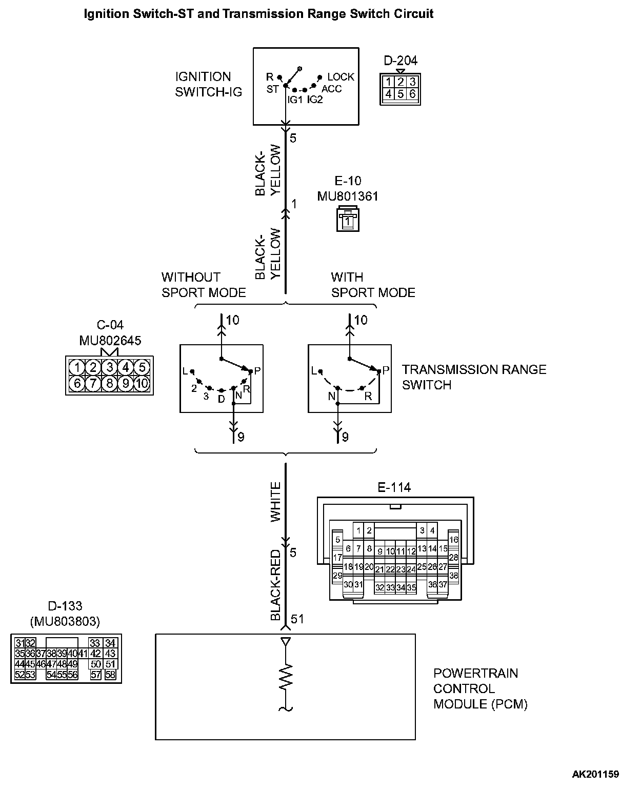 - If the selector lever is moved to "P" or "N" range and the ignition switch is turned to "START" position, battery positive voltage is supplied to PCM (terminal No. 51) through the ignition switch and transmission range switch. Because of this, the PCM detects that the engine is cranking.