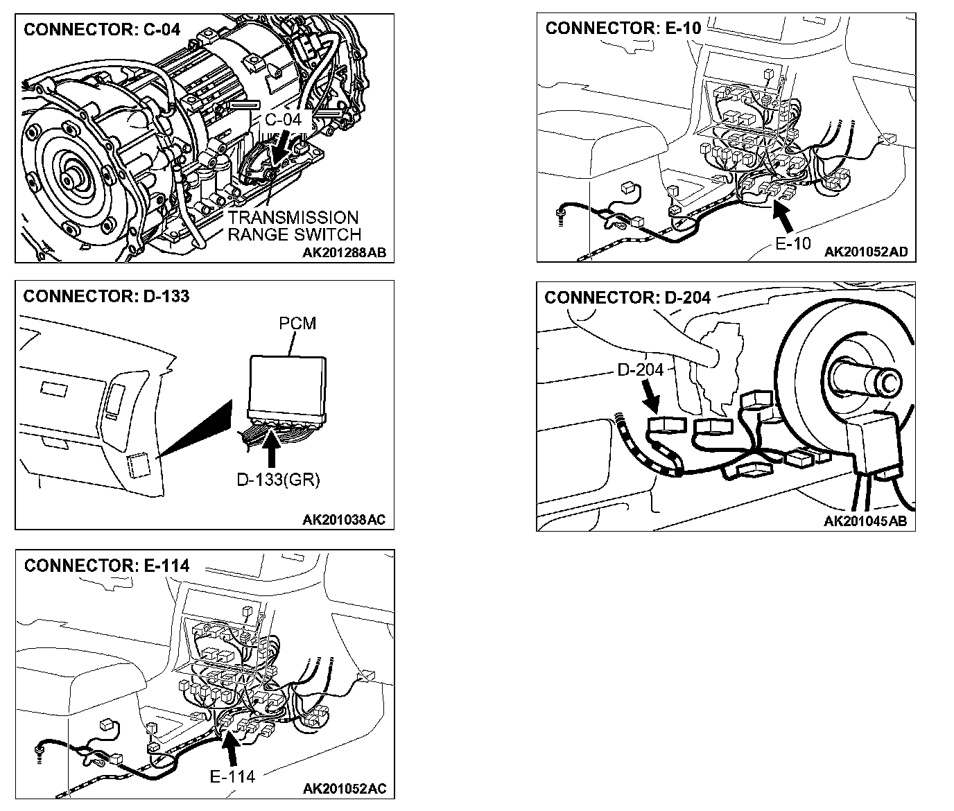 STEP 5. Check for open circuit and short circuit to ground and harness damage between transmission range switch connector C-04 (terminal No. 9) and PCM connector D-133 (terminal No. 51).