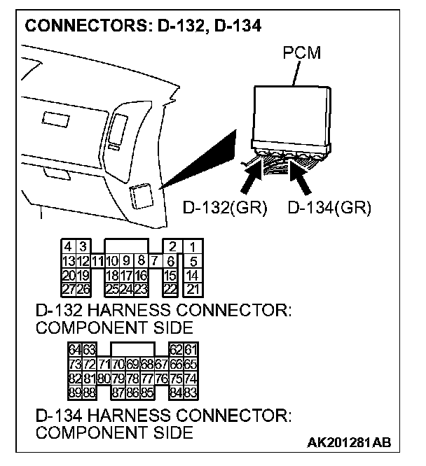 STEP 1. Check harness connector D-132, D-134 at PCM for damage.