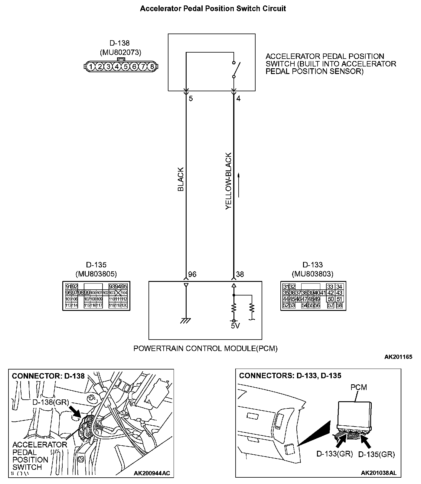STEP 8. Check for open circuit and harness damage between accelerator pedal position switch connector D-138 (terminal No. 5) and PCM connector D-135 (terminal No. 96).