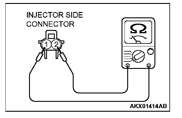 3. Measure the resistance between injector side connector terminal No. 1 and No. 2.