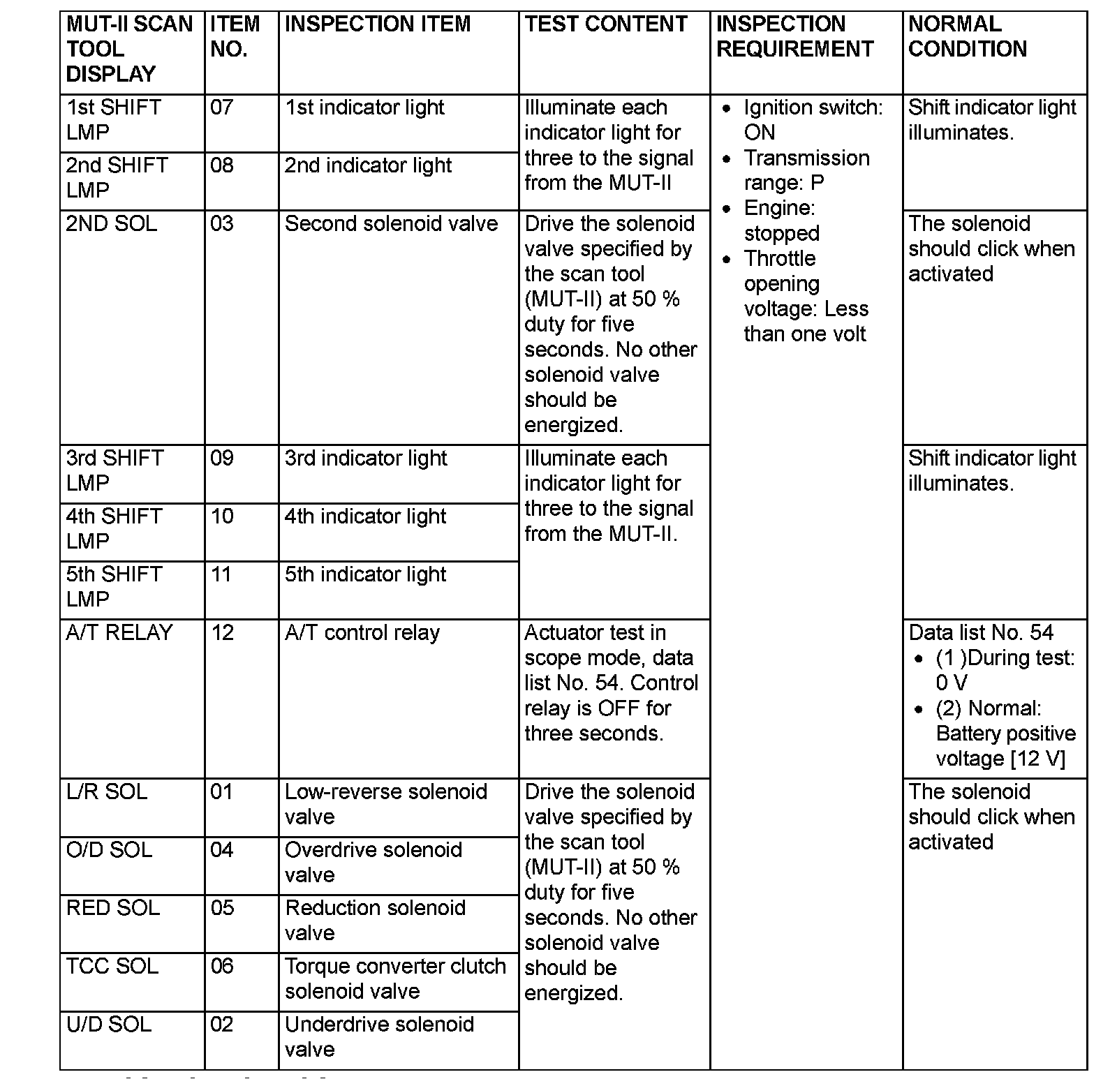 Actuator Test Reference Table