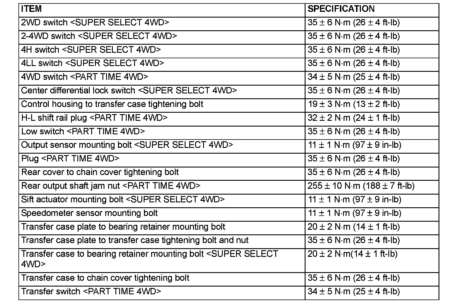 TORQUE SPECIFICATION