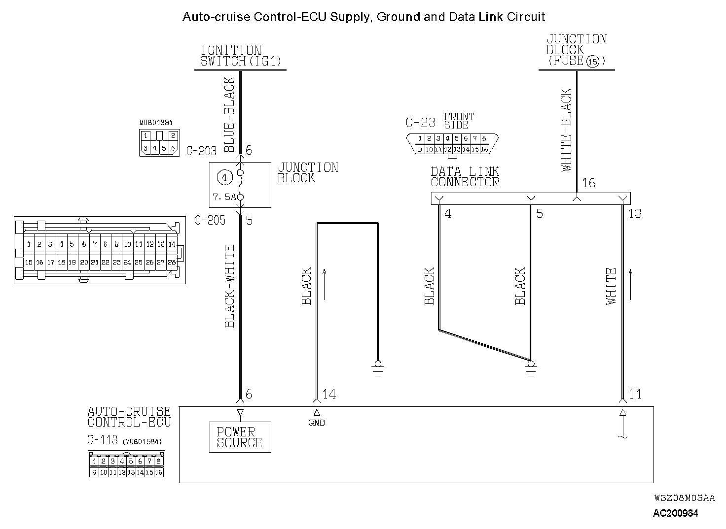 Communication with Scan Tool MB991502 is not Possible (Communication with the Auto-cruise Control-ECU Only is not Possible.)Auto-Cruise Control-ECU Supply, Ground And Data Link Circuit Part 1: