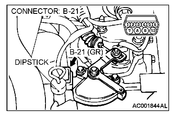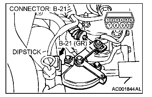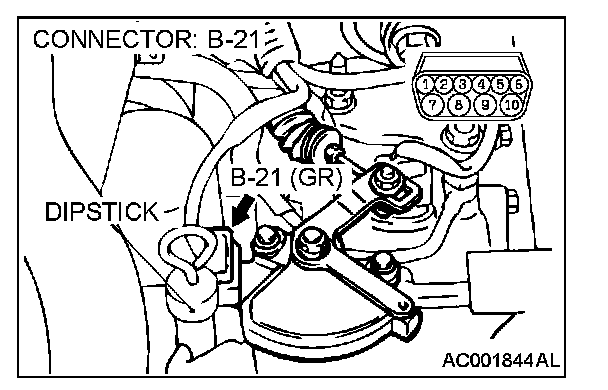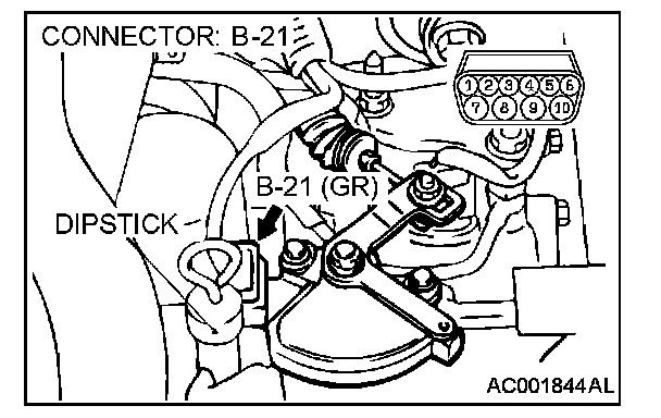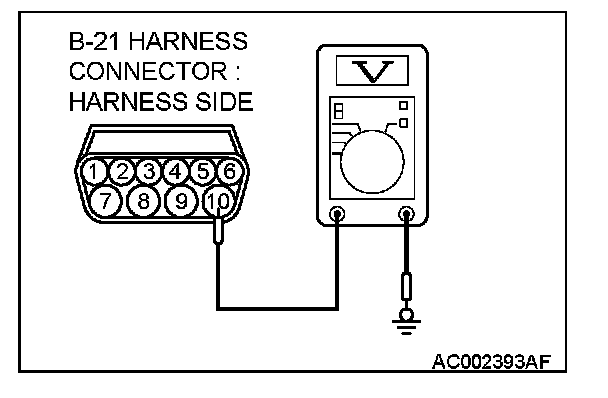 STEP 1. Measure the output circuit voltage at park/neutral position switch connector B-21 (terminal 10) by backprobing.