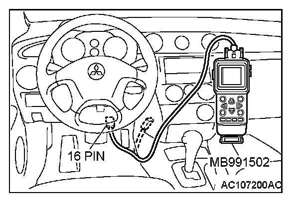 CAUTION: To prevent damage to scan tool MB991502, always turn the ignition switch to the "LOCK" (OFF) position before connecting or disconnecting scan tool MB991502.