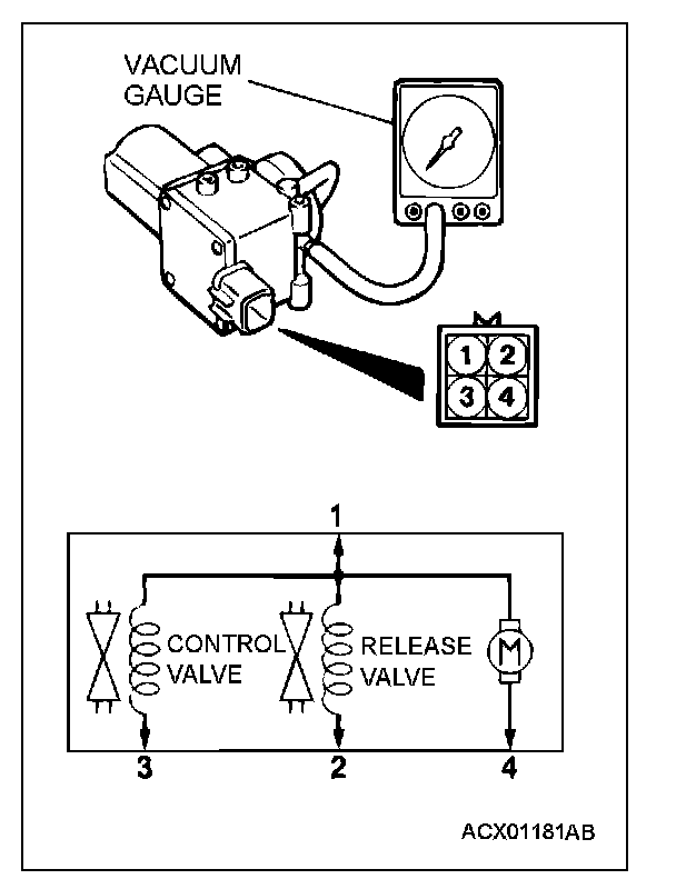 - Connect the positive battery terminal to auto-cruise control vacuum pump connector terminal 1, and the negative battery terminal to terminals 2, 3, and 4. Then the vacuum gauge should read 27 kPa (8.0 in.Hg) or more.