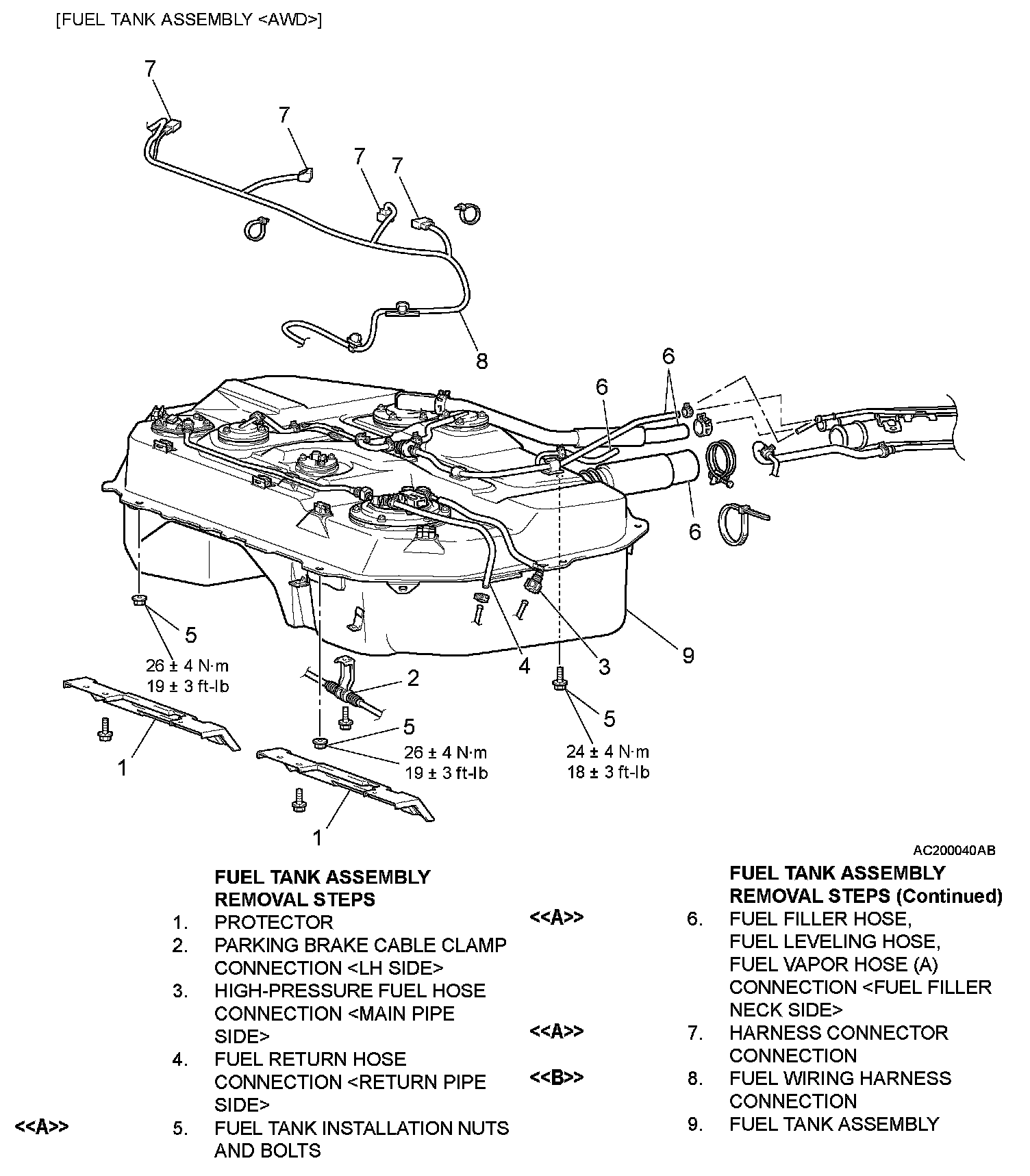<> FUEL TANK INSTALLATION NUTS AND BOLTS/HARNESS CONNECTOR CONNECTION REMOVAL