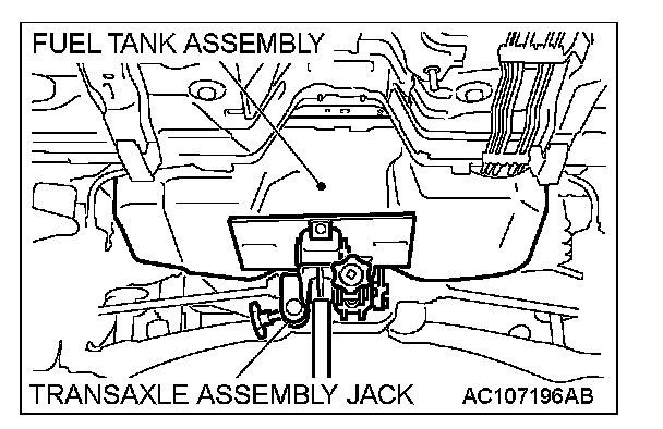 CAUTION: Support the fuel tank assembly securely so that it does not fall off from the transaxle jack.