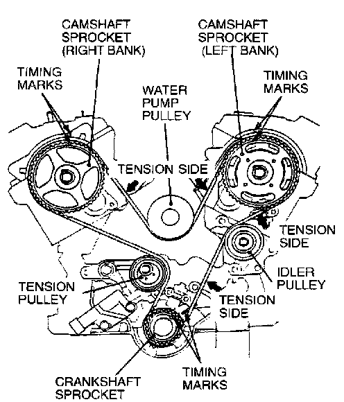 3. Turn the camshaft sprocket (right bank) counterclockwise until the tension side of the timing belt is firmly stretched, and then check again that all timing marks are aligned.