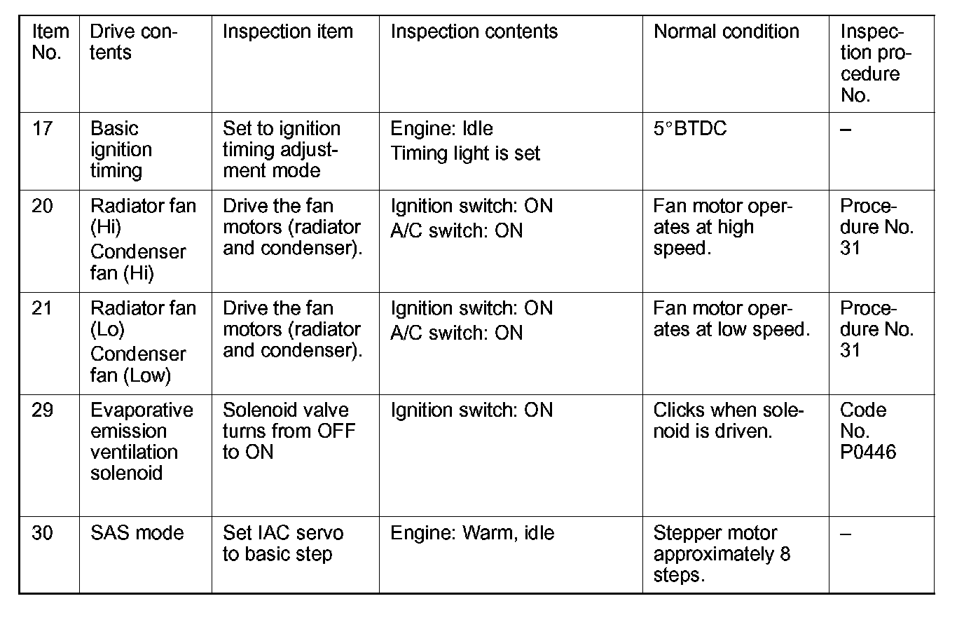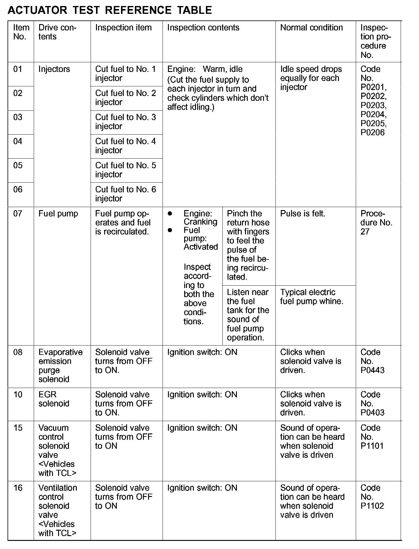 Actuator Test Reference Table