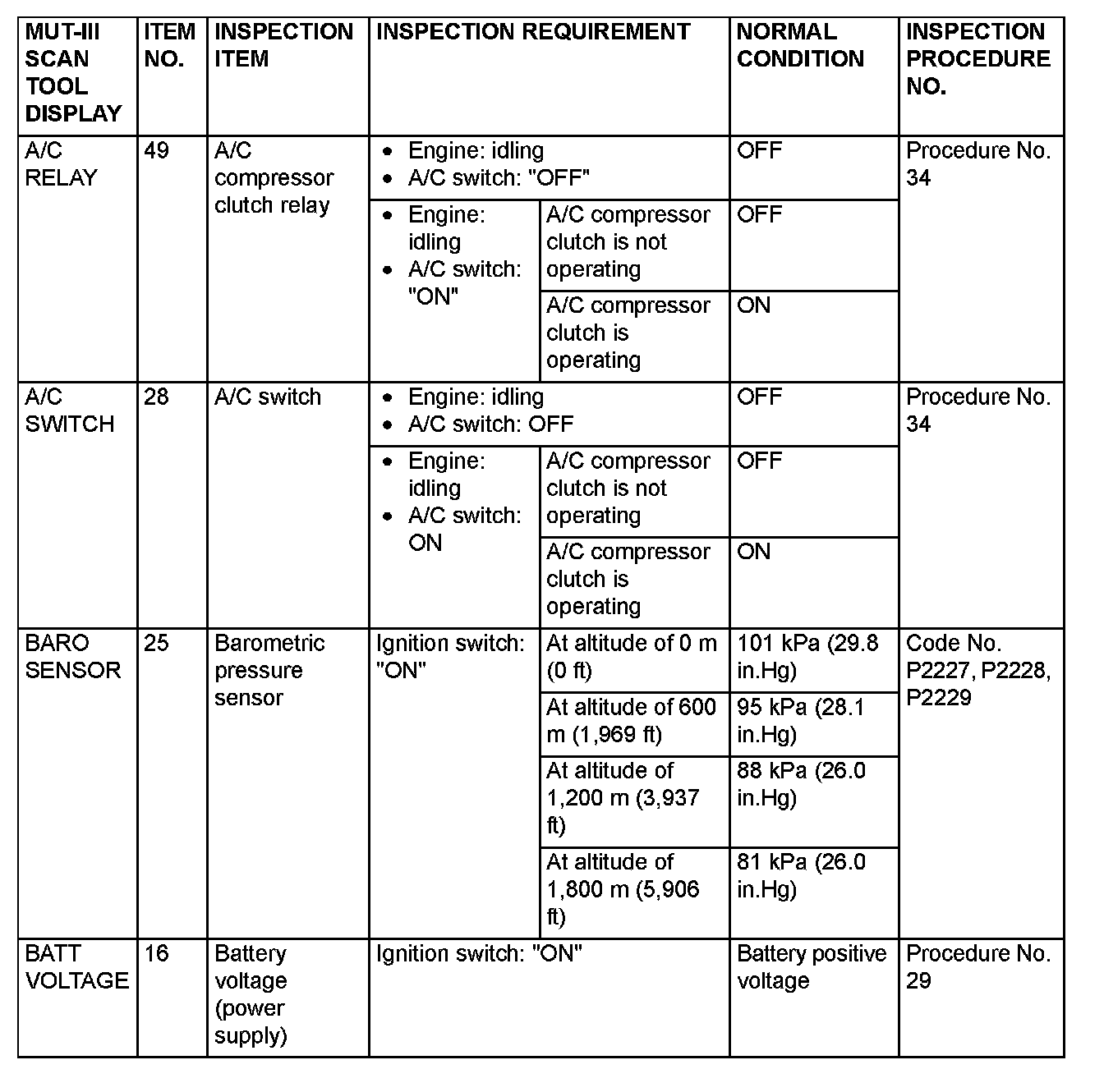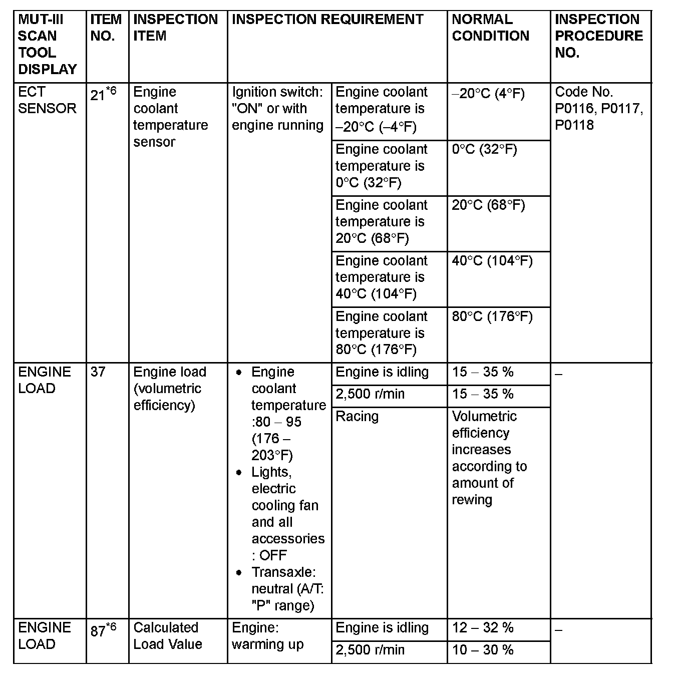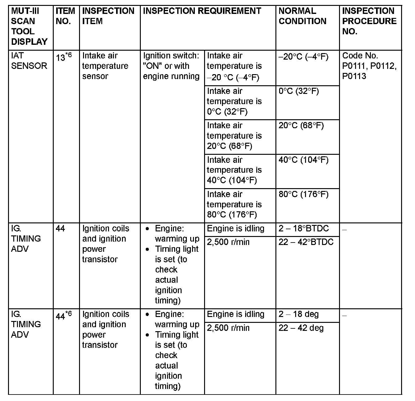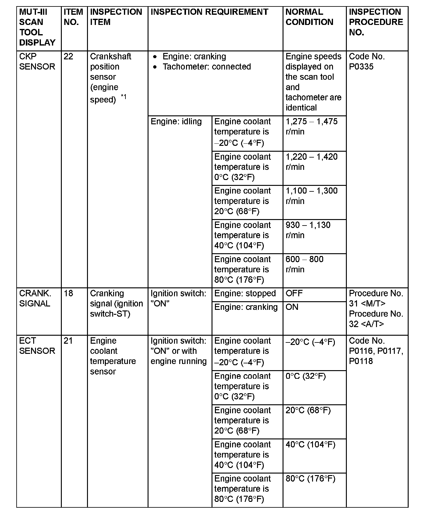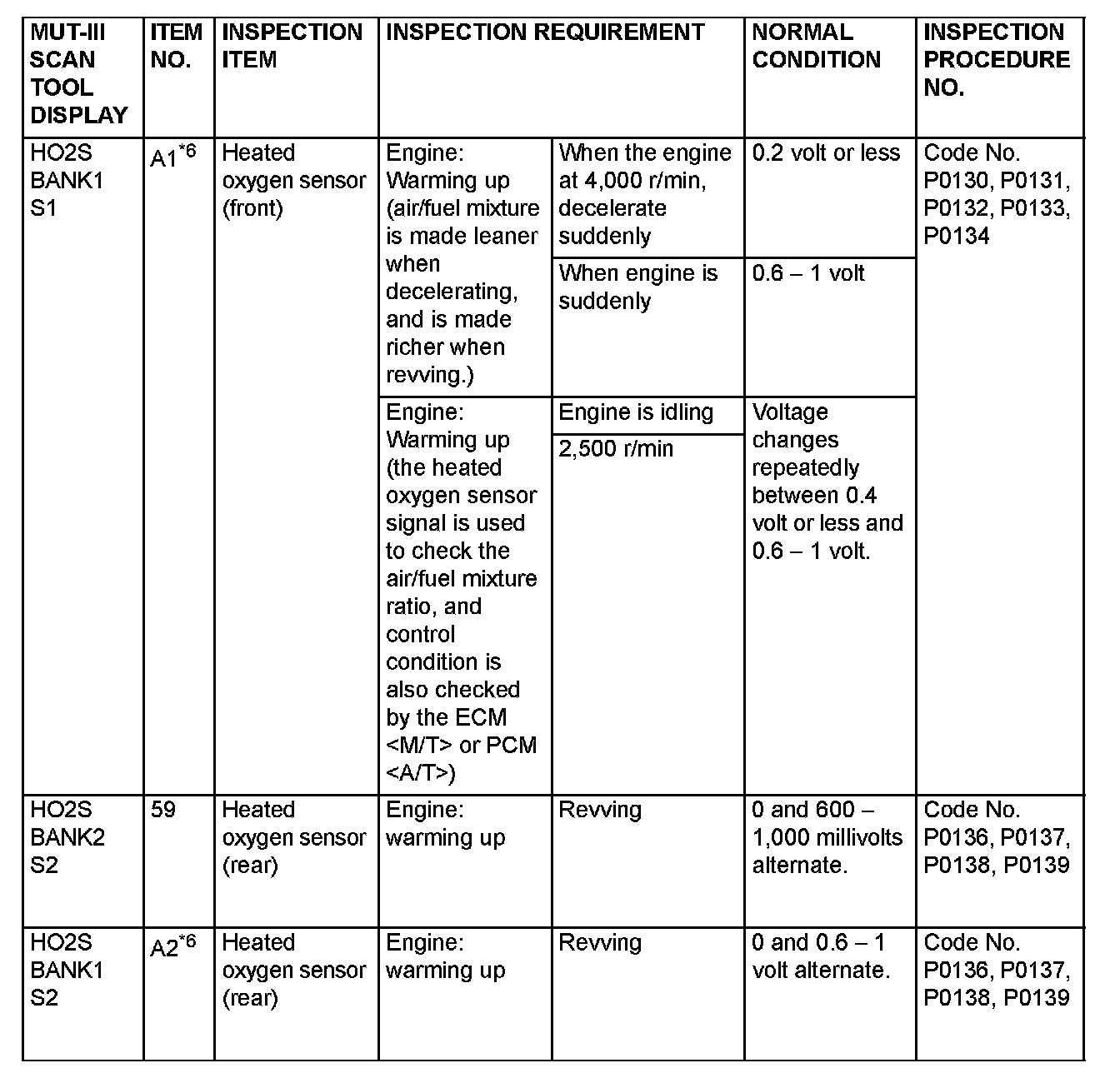 *6: GST items. [Data list items consist of MUT-III items and GST items. GST items can be accessed through the use of a general scan tool (GST). When scan tool MB991958 (MUT-III sub assembly) is used, MUT-III items appear alphabetically; then, GST items appear alphabetically. The black and white characters of the GST items are inverted from the MUT-III items.]