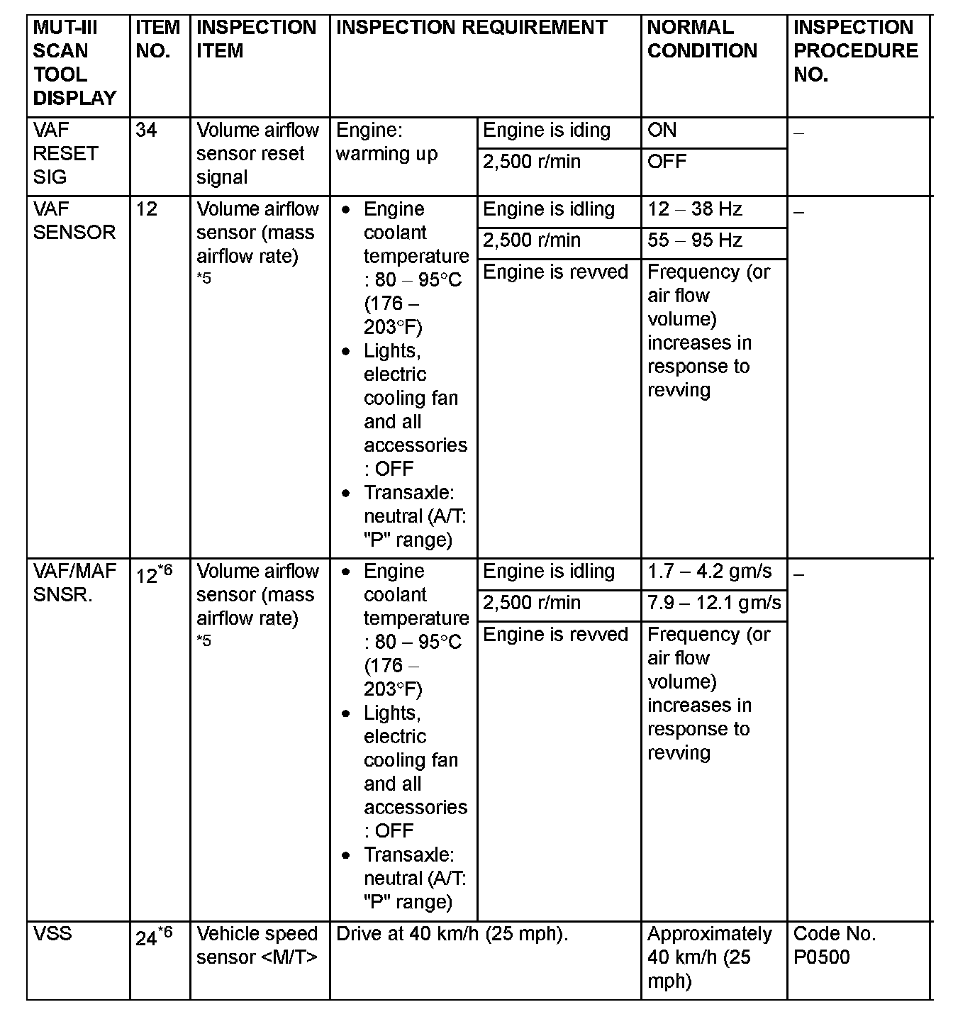 *5: In a new vehicle [driven approximately 500 km (311 mile) or less], the volume airflow sensor output frequency is sometimes 10% higher than the standard frequency.