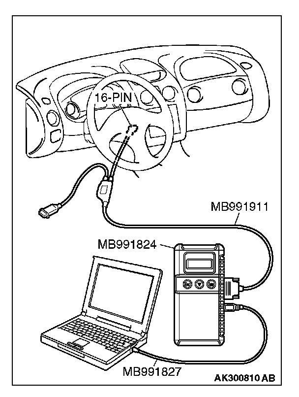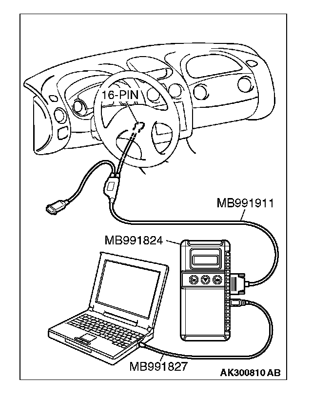 CAUTION: To prevent damage to scan tool MB991958, always turn the ignition switch to the "LOCK" (OFF) position before connecting or disconnecting scan tool MB991958.