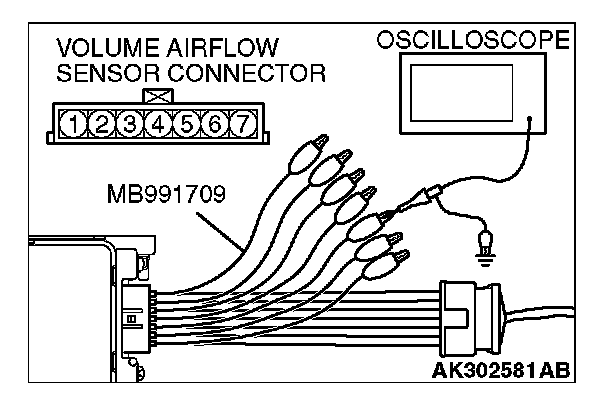 1. Disconnect the volume airflow sensor connector, and connect the test harness special tool (MB991709) in between. (All terminals should be connected.)