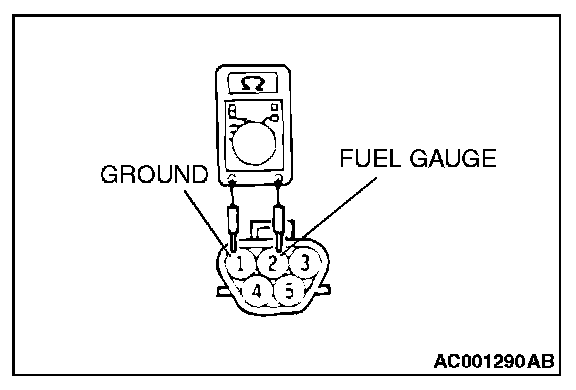 1. Check that resistance value between the fuel gauge terminal and ground terminal is at the standard value when the fuel level sensor float is between point "F" (highest) and point "E" (lowest).