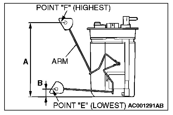 1. Move the float and measure height A at point "F" (highest) and B at point "E" (lowest) with the float arm touching stopper.