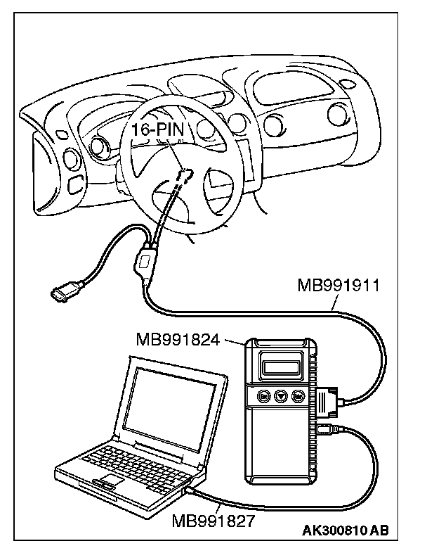 CAUTION: To prevent damage to scan tool MB991958, always turn the ignition switch to the "LOCK" (OFF) position before connecting or disconnecting scan tool MB991958.