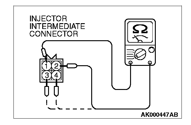 2. Measure the resistance between each injector side connector terminals No. 1 and No. 2.