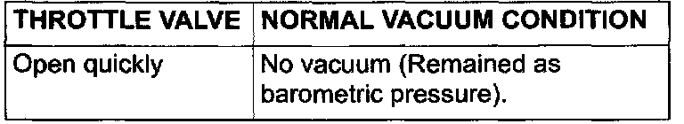2. Start the engine. As described in the chart, check the vacuum condition when the throttle valve is opened suddenly (rewing) during cold and hot engine conditions.