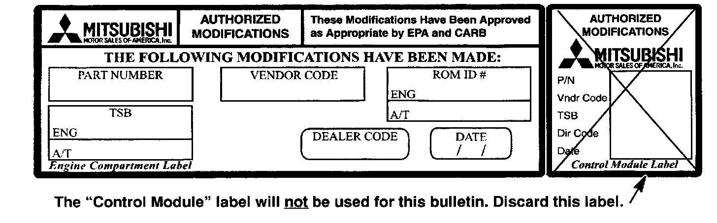 11. Using a ball-point pen, enter the appropriate PCM part number, vendor number, ROM ID #, this TSB number TSB-04-13-003), your dealer code, and the current date on the Engine Compartment Label (part no. MSSF-024G-00).