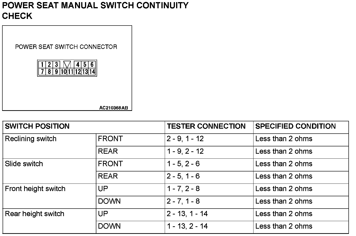 POWER SEAT MANUAL SWITCH CONTINUITY CHECK