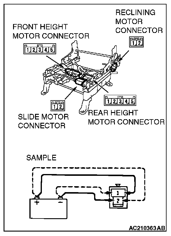 2. Connect the battery power supply to the terminal 2 and ground the terminal 1 for the front reclining side, rear slide side.