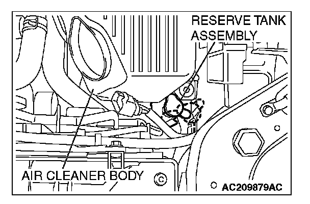Position the reserve tank assembly out of the way. The reserve tank assembly cannot be removed completely from the engine compartment.