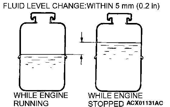 4. Check the fluid in the oil reservoir for foaming or milkiness. Check the difference of the fluid level when the engine is stopped, and while it is running. If the fluid contains air or has milky appearance, or the fluid level fluctuate by 5 mm (0.2 inch) or more, power steering system air bleeding should be done.