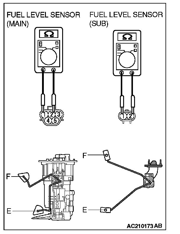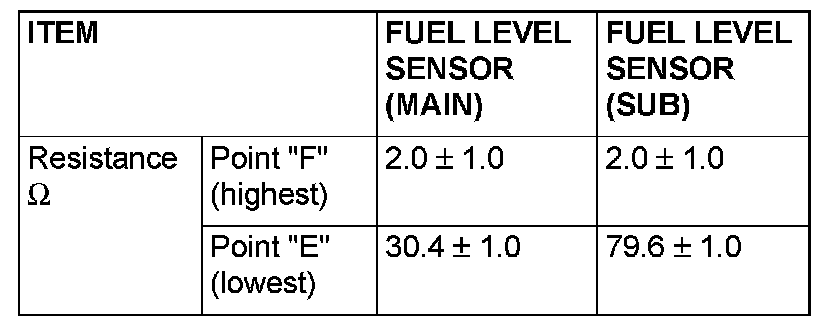 1. Check the resistances between fuel level sensor main terminals 1 and 2 as well as sub terminals 1 and 2 of the fuel pump module, respectively.