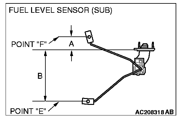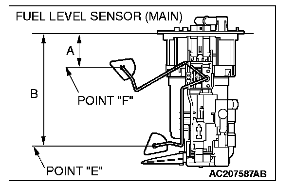 1. Move the float and measure height A at point "F" (highest) and B at point "E" (lowest).