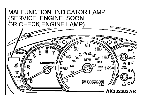 NOTE: If the Malfunction Indicator Lamp (SERVICE ENGINE SOON or Check Engine Lamp) illuminates because of a malfunction of the powertrain control module (PCM), communication between the scan tool MB991958 (MUT-III sub assembly) and the PCM is impossible. In this case, the diagnostic trouble code cannot be read.