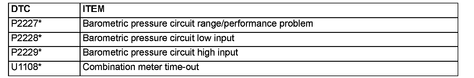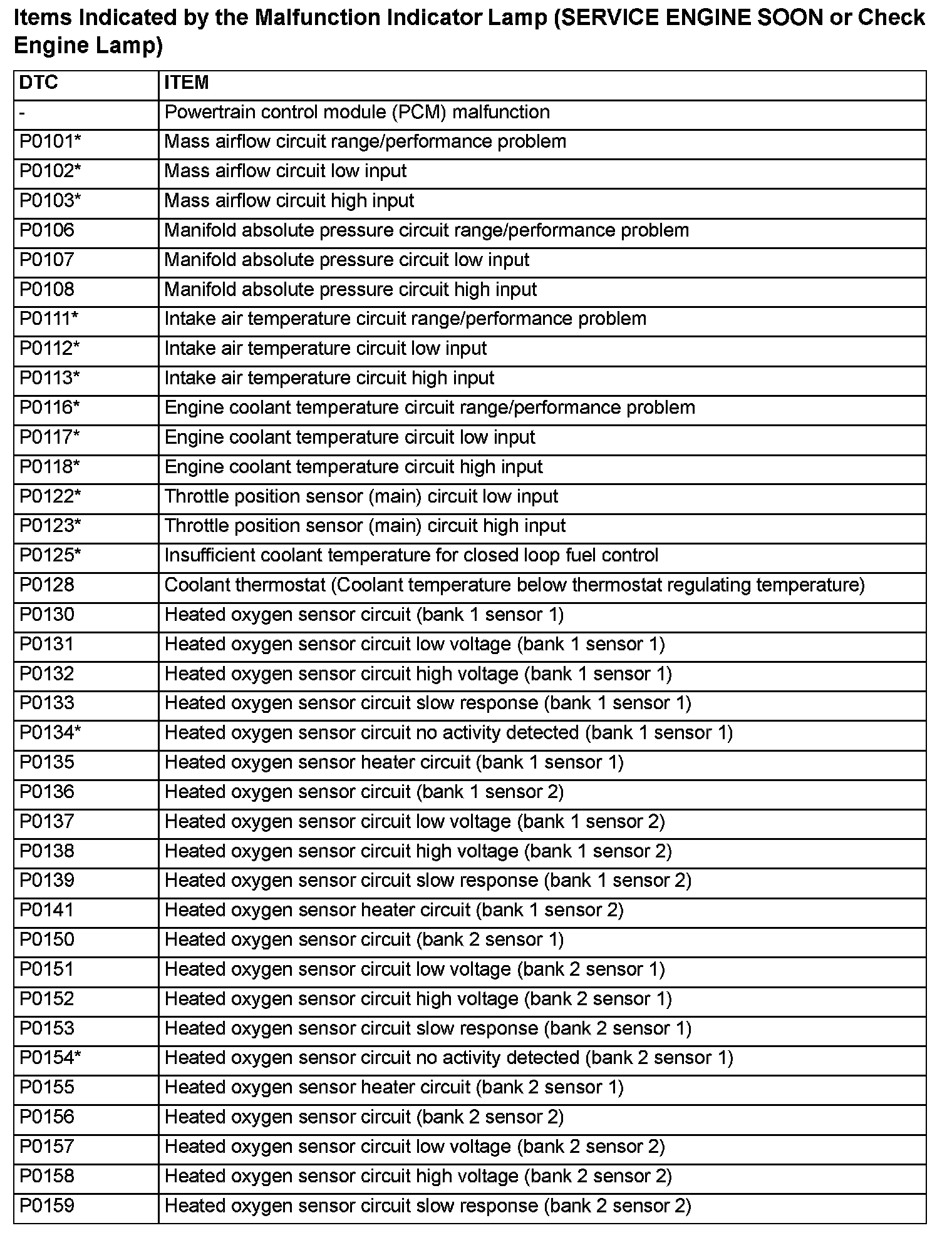 NOTE: After the PCM has detected a malfunction, the Malfunction Indicator Lamp (SERVICE ENGINE SOON or Check Engine Lamp) illuminates when the engine is next turned on and the same malfunction is re-detected. However, for items marked with a "*" in the DTC NO. column, the Malfunction Indicator Lamp (SERVICE ENGINE SOON or Check Engine lamp) illuminates only on the first detection of the malfunction.