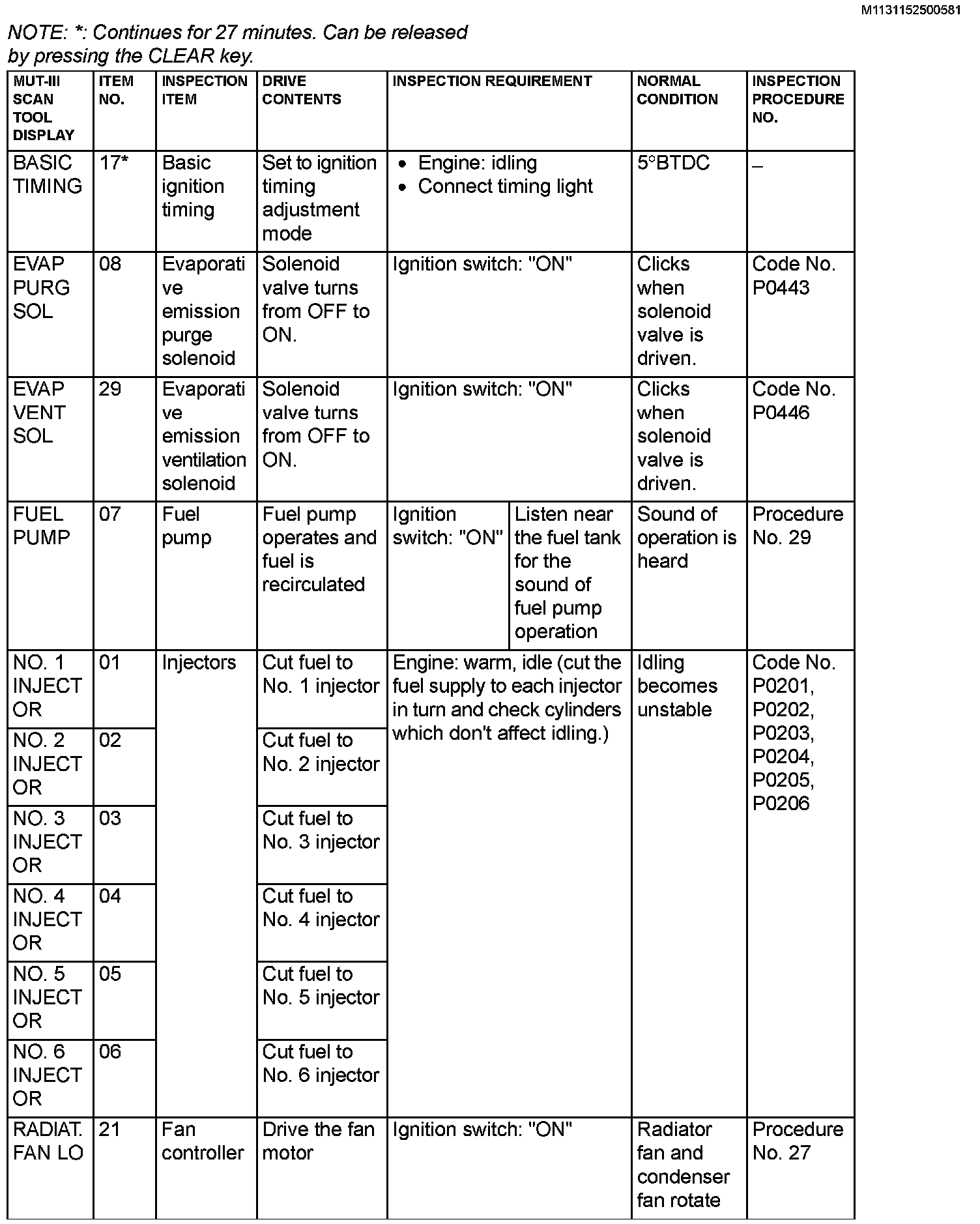 Actuator Test Reference Table