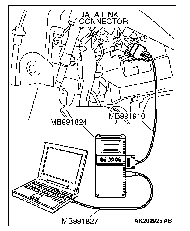 CAUTION: To prevent damage to scan tool MB991958, always turn the ignition switch to the "LOCK" (OFF) position before connecting or disconnecting scan tool MB991958.
