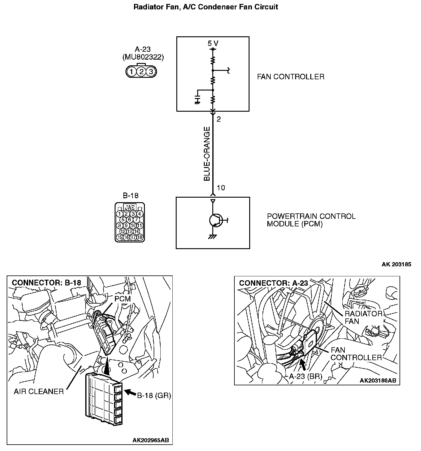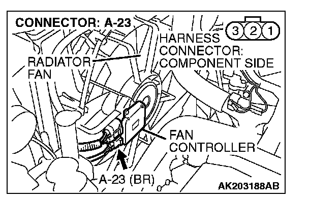 STEP 3. Check for open circuit and short circuit to ground and harness damage between fan controller A-23 (terminal No. 2) and PCM connector B-18 (terminal No. 10).