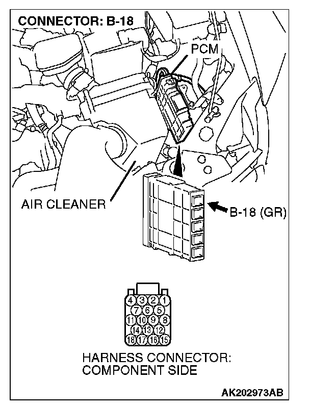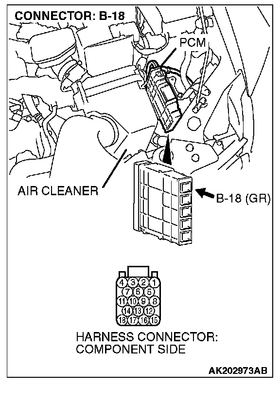 STEP 1. Check harness connector B-18 at PCM for damage.