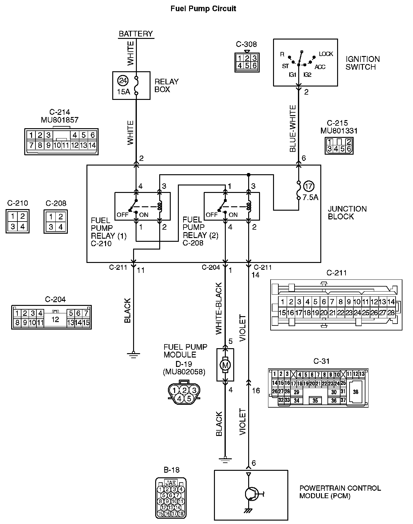 NO: Check harness connectors C-31 and C-211 at intermediate connector for damage, and repair or replace as required. Refer to Harness Connector Inspection. If intermediate connectors are in good condition, repair harness wire between fuel pump relay 2 connector C-208 (terminal No. 2) and PCM connector B-18 (terminal No. 6) because of open circuit. Then confirm that the malfunction symptom is eliminated.